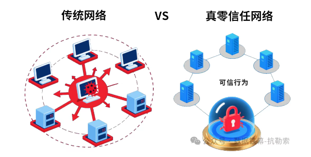 如果说AI解决了“提前发现”的问题,那么如何遏制已侵入网络系统的病毒蔓延,成为重中之重。在这里,我们看到J9国际站 J9 抗勒索技术的第二个优势:从“永不信任”的零信任1.0,进化到“基于可信”的真零信任2.0。